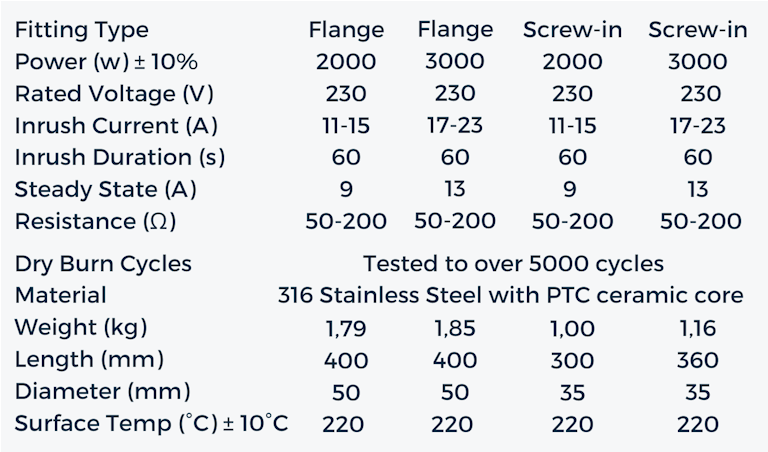 Due to the positive temperature coefficient (PTC) ceramic chips, XTEND elements stop drawing current when the PTC reaches 240°C. This is an attribute of PTC and does not require a thermostat.